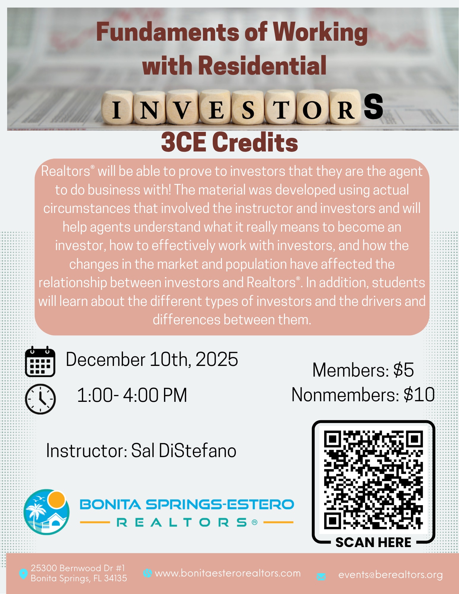 Realtors® will be able to prove to investors that they are the agent to do business with! The material was developed using actual circumstances that involved the instructor and investors and will help agents understand what it really means to become an investor, how to effectively work with investors, and how the changes in the market and population have affected the relationship between investors and Realtors®. In addition, students will learn about the different types of investors and the drivers and differences between them. Objectives: •Enlarge their market by adding investors as customers. •Create investors from their existing base. •Provide strategies to current investors as it relates to finance. •Build more relationships through the knowledge gained. •Help future investors find the way to success through finance. • Instructor: Sal Di Stefano